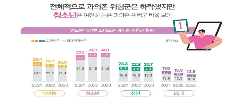 위험군으로 분류되었습니다. 이는 10명 중 4명꼴로 스마트폰 사용이 조절되지 않는다는 것을 의미합니다.
